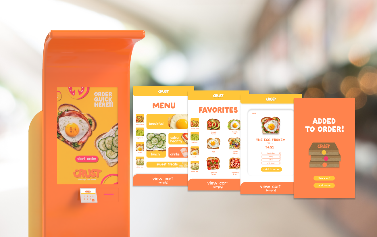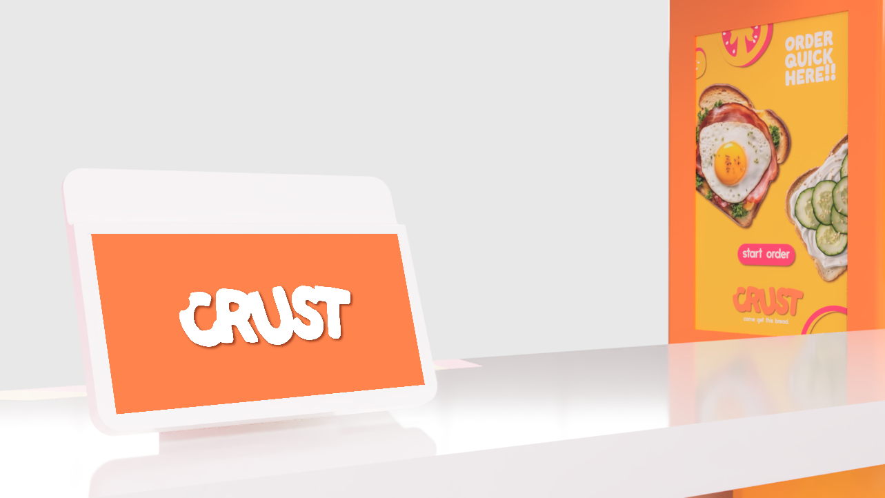CRUST is a Food Kiosk aimed at college students, to offer a variety of quick sandwich-like lunch options for anyone needing a bite to pick up and go. It was designed to reduce traffic congestion to encourage easier flow, with faster ordering and pickup areas.